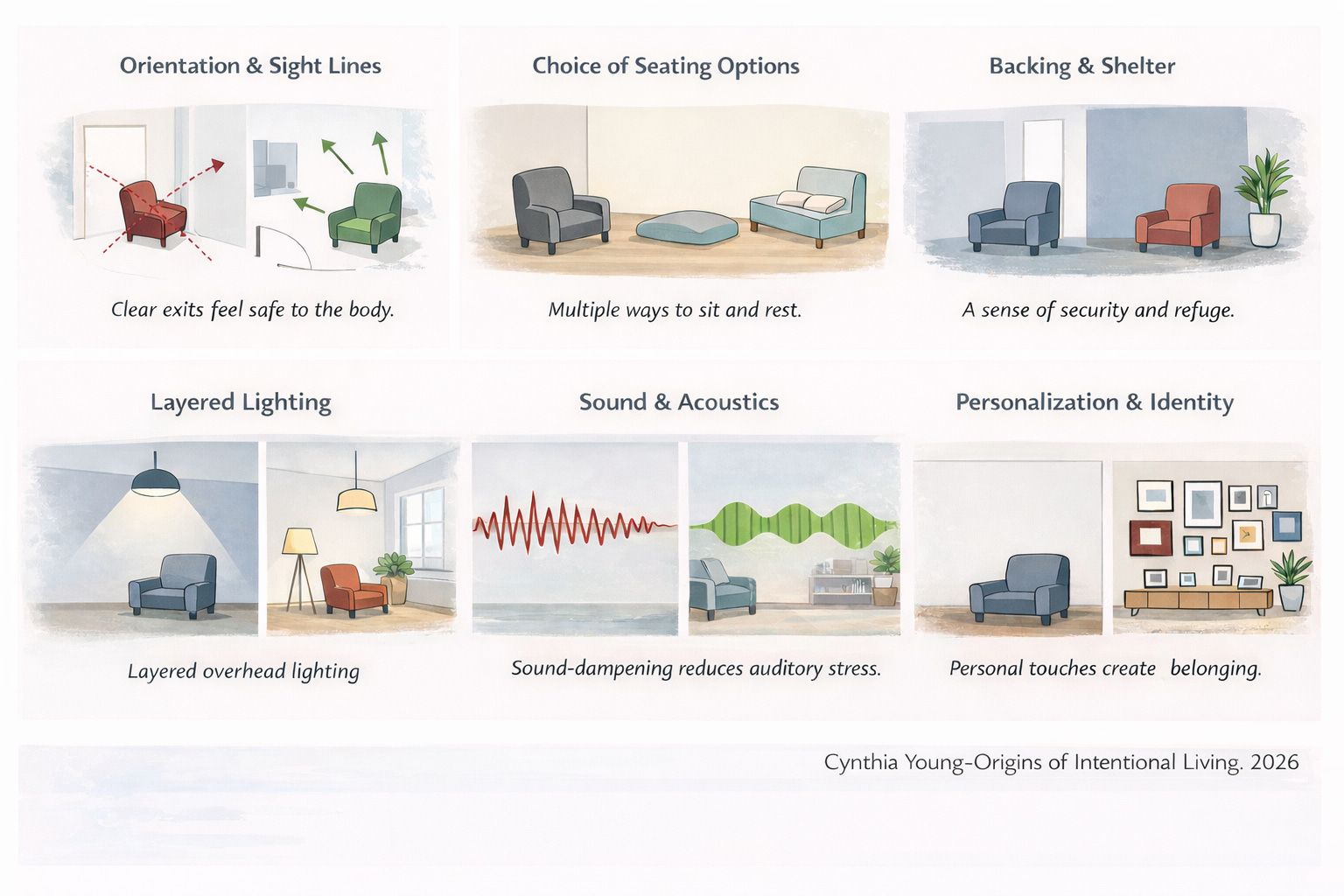 What I saw: Her lighting was uniformly bright and overhead. Her furniture offered little backing. Her rooms had no obvious places to arrive or retreat. Her walls were blank in the name of calm. (minimalism removes sensory anchors) Her nervous system was adapting over and over the entire time she was home.